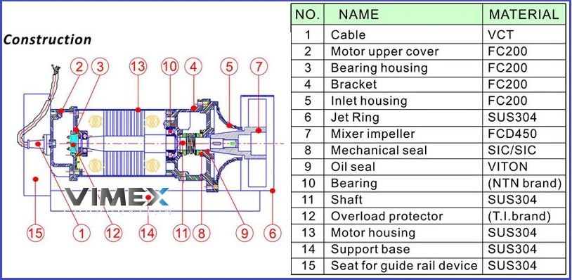 Thiết bị này gồm động cơ điện ba pha, cánh khuấy (impeller) và khung thân chịu môi trường nước.